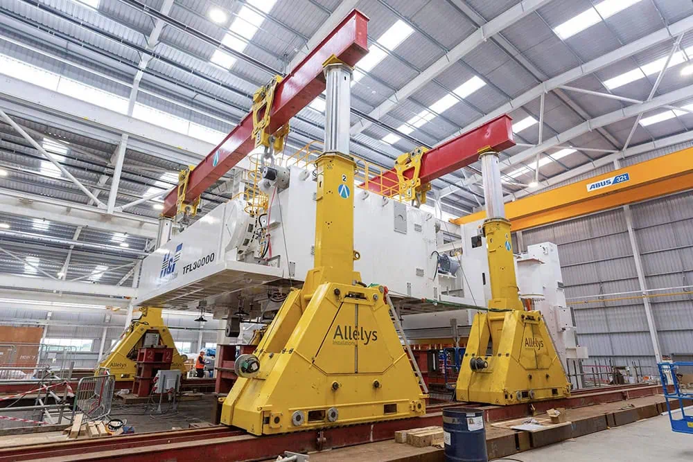 The main components included a 172te bed, a 110te slide and a 350te crown. The team designed a solution to use a combination of hydraulic lifting gantries as well as jacking systems, versa lifts and mobile cranes to complete the project.