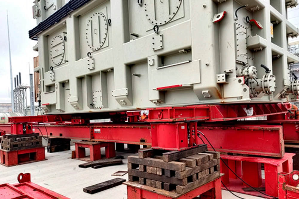 Therefore extendable beams were positioned on the trailers prior to the transformers being loaded. Retracted, these beams allowed the trailer to run on public roads at normal width and when extended enabled the units to be stooled off on site. The transformer units could then be transshipped to SPMT before being maneuvered into the offload area. The extended beams were then used to jack up the load, enabling the skid beams to be positioned and the extendable beams to be removed. The transformers could then be skidded into their individual bunds before being jacked down to final position.