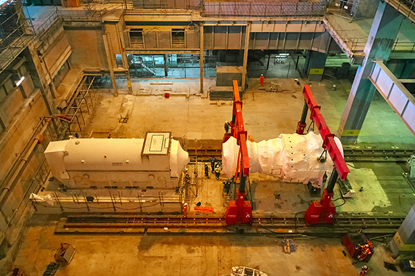 Once at site, the generator was transhipped back onto SPMT, transported to the turbine hall, lifted with a four-point lift system, lowered onto foundation. The same process was then repeated with the turbine.