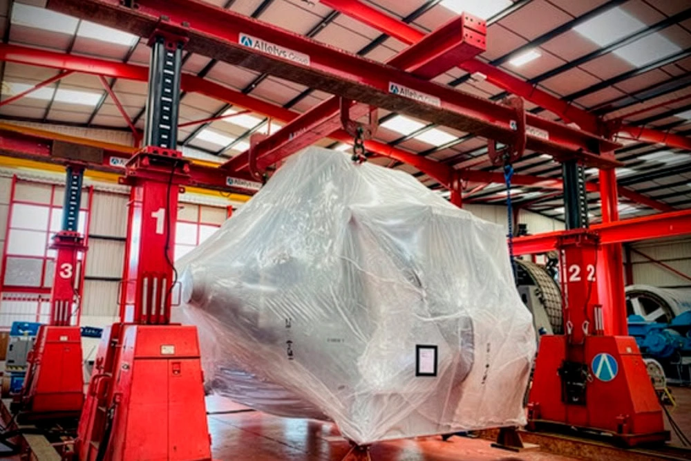A bespoke lifting solution was required to accommodate the manufacturers lifting points built into the unit. The Allelys team engineered a three lift beam arrangement to be used in conjunction with a 200te capacity hydraulic gantry system to lift the engine.